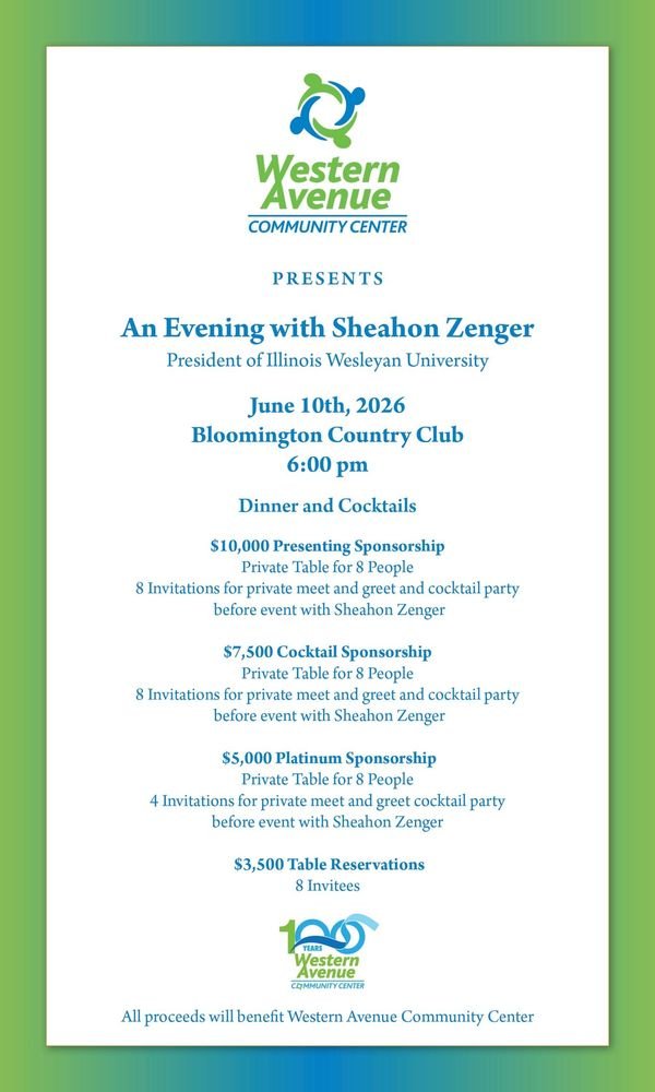 Join us for An Evening with Sheahon Zenger on June 10th at the Bloomington Country Club as we gather in support of Western Avenue Community Center. We are honored to welcome Sheahon Zenger, President of Illinois Wesleyan University, as our featured guest for the evening. This fundraising event will bring our community together for an inspiring night filled with meaningful conversation, connection, and a shared commitment to strengthening the west side of Bloomington.